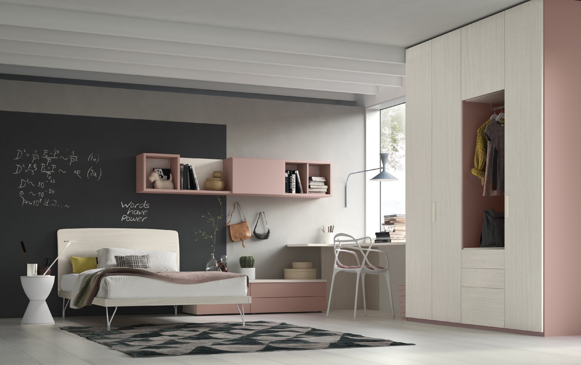 Il letto Nap da una piazza e mezza diventa il fulcro dell’ambiente, elegante e confortevole nella sua essenzialità. La scrivania ad angolo crea un’area studio raccolta e funzionale, perfettamente integrata nella composizione. L’armadio, arricchito da un vano a giorno colorato, introduce un dettaglio decorativo che illumina e movimenta l’insieme.