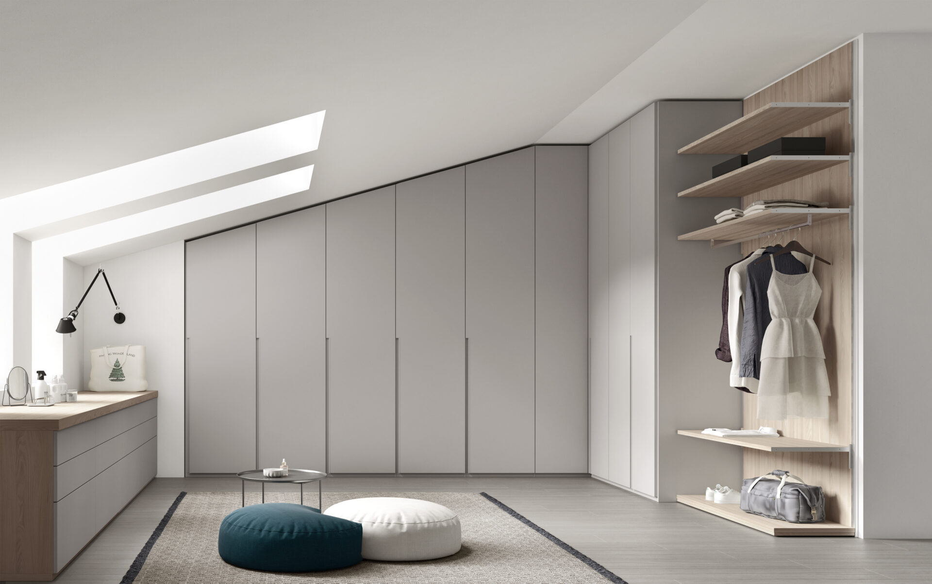 Armadi su misura, aperture ampie e alternanza di pieni e vuoti valorizzano l’ambiente mansardato, creando una composizione completa, fluida e luminosa.