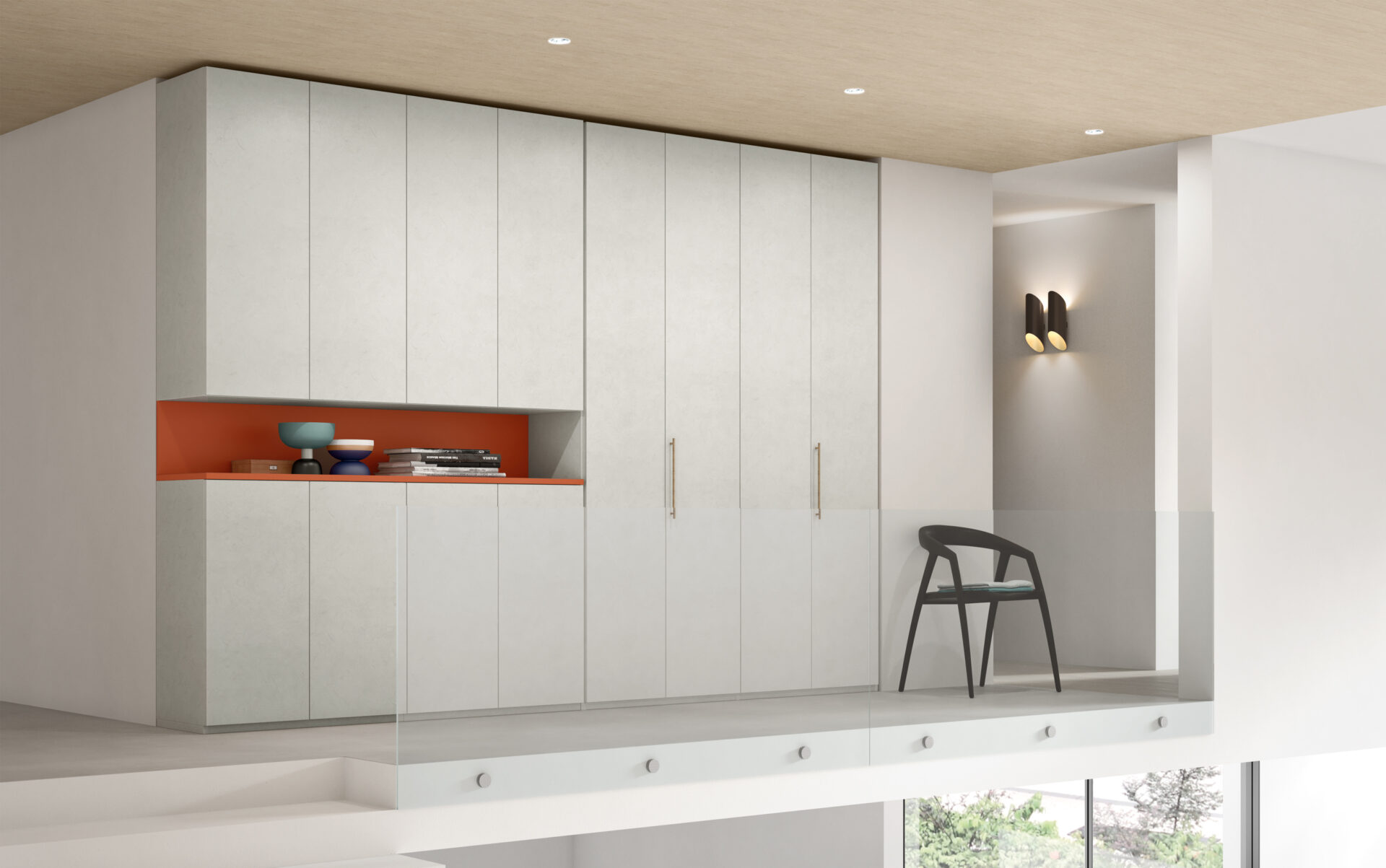 Il vano a giorno colorato alleggerisce l’armadiatura e aggiunge personalità, creando una soluzione di passaggio che unisce carattere, praticità e continuità visiva.