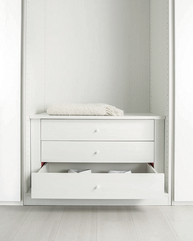 The open module lightens the look of the piece. The space between the doors can be organised to create a compact walk-in wardrobe.