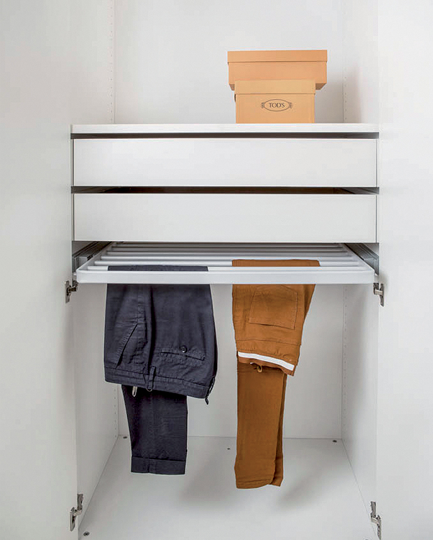 La modularità consente di creare soluzioni su misura con articoli di serie, che si prestano bene ad arredare stanze con architetture particolari. Colonne a vista e moduli ad anta battente si alternano per garantire il giusto contenimento, anche nel garage di casa.