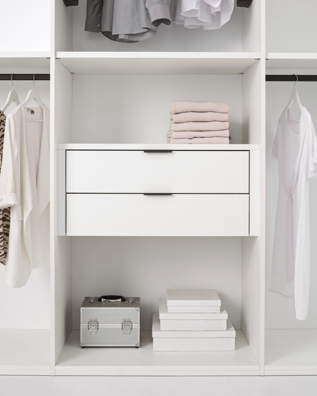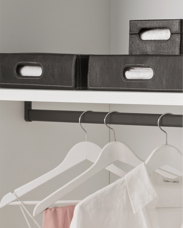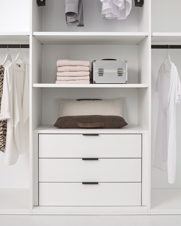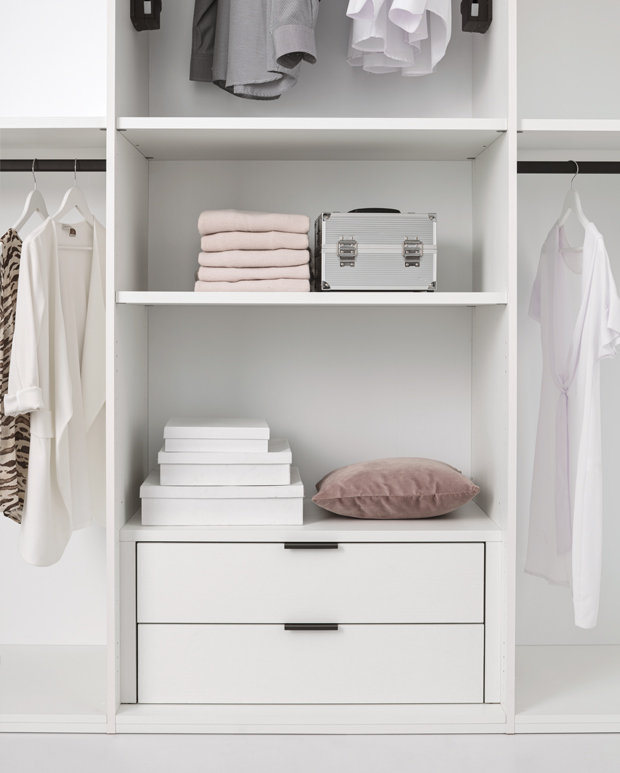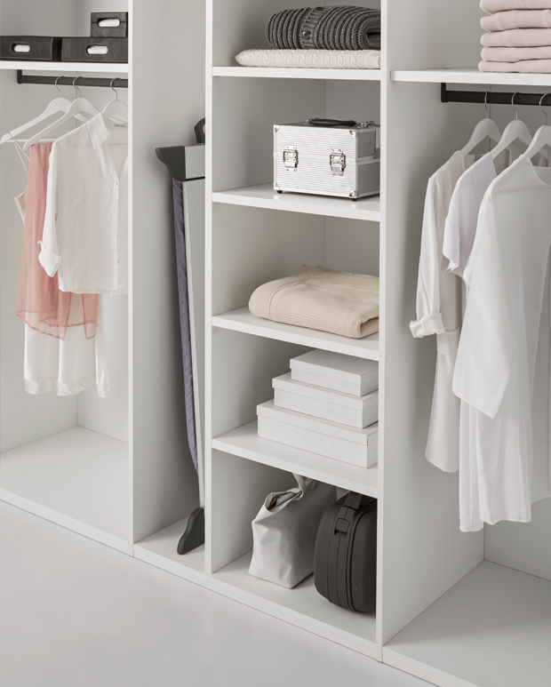 Gli armadi si modellano in base allo spazio e permettono di sfruttare al meglio anche gli ambienti mansardati.L’armadio è impreziosito dalla presa maniglia a gola parziale e affiancato a una cabina armadio con sistema a cremagliera. L’alternanza di volumi chiusi e aperti arreda uno spazio completo e su misura.