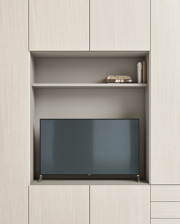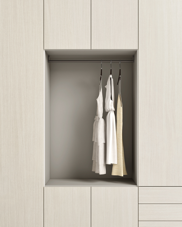 I grandi spazi possono contare su armadiature integrate con moduli di varie dimensioni, vani a giorno attrezzati e cassettiere.I cassetti esterni sono un’ottima soluzione per organizzare al meglio il contenuto dell’armadio. Possono avere una presa maniglia a gola o un’apertura push pull, a seconda delle esigenze estetiche e di praticità.
