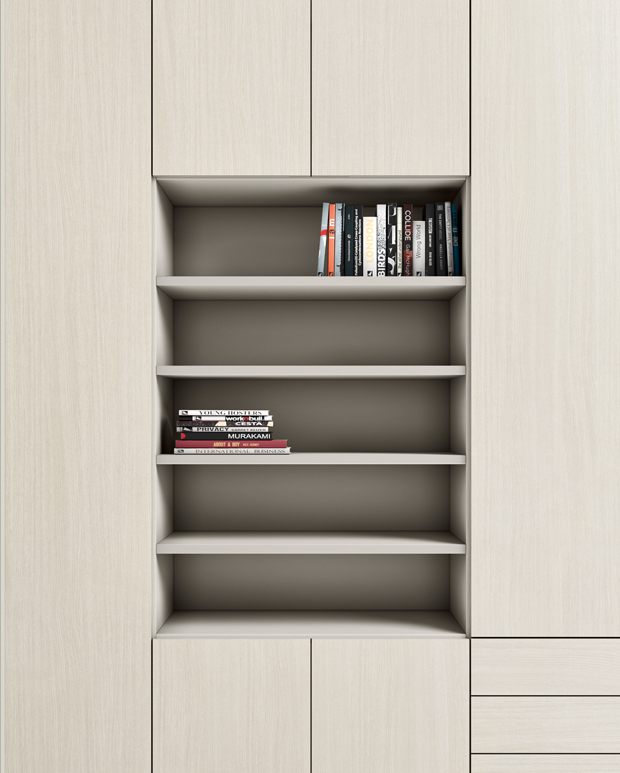 Il modulo con ripiani introduce nell’armadiatura una libreria per portare in qualsiasi stanza lo stile del living.